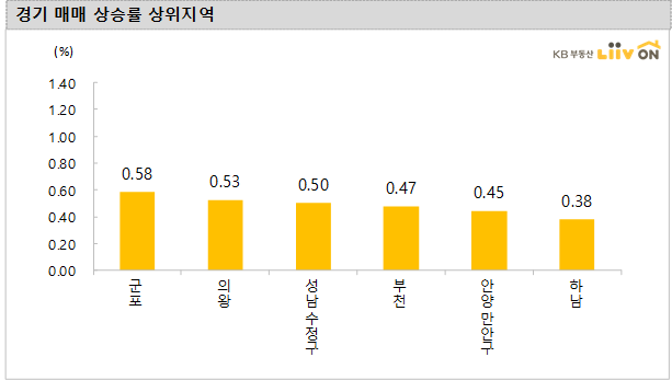 - 경기는 전주 대비 0.20%의 변동률을 기록하면서 지난주의 상승률 0.24%보다 상승폭이 줄었습니다. 주간 상승률이 상대적으로 높은 지역은 군포(0.58%), 의왕(0.53%), 성남 수정구(0.50%), 부천(0.47%) 등 입니다.