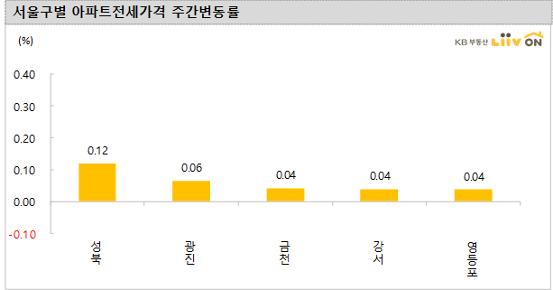 - 서울(0.02%)은 보합권에 가까운 미미한 상승을 기록했다. 성북구(0.12%)만 소폭 상승했고, 광진구(0.06%), 금천구(0.04%), 강서구(0.04%) 등은 미미한 상승을 보였습니다.