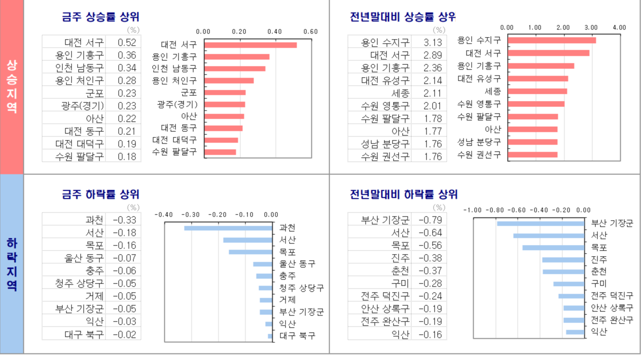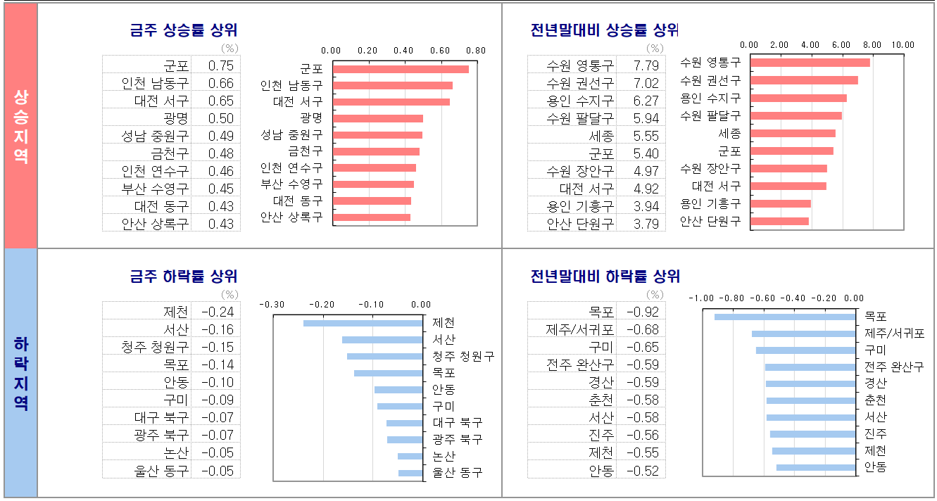 - 인천(0.13%)은 남동구(0.34%), 미추홀 구(0.15%)가 상승을 보였습니다.