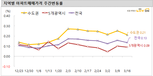 3월 16일 전국 아파트 매매 가격 변동률은 전주 대비 상승(0.13%)을 기록했습니다.