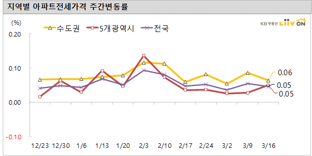 전국 아파트 전세 가격은 전주대비 0.05% 상승을 기록했다. 수도권(0.06%)과 5개 광역시(0.05%)는 전주대비 상승했고, 기타 지방(0.00%)은 전주대비 보합이다.
