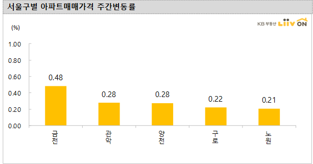 - 서울 아파트 매매 가격은전주 대비 0.12%로 상승폭 둔화가 계속되고 있습니다. 주간 상승률이 상대적으로 높은 구는 금천구(0.48%), 관악구(0.28%), 양천구(0.28%), 구로구(0.22%) 순으로 다른 구에 비해 상승폭이 높았습니다. 서초구(0.00%), 강남구(0.01%), 강동구(0.08%), 송파구(0.10%), 뿐만 아니라 마포구(0.06%), 용산구(0.08%)도 상승세도 줄었습니다.