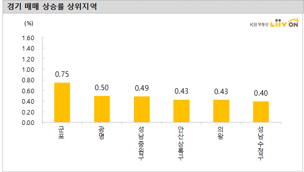 - 경기는 전주 대비 0.24%의 변동률을 기록하면서 지난주의 상승률0.29%보다 상승폭이 줄었습니다. 주간 상승률이 상대적으로 높은 지역은 군포(0.75%), 광명(0.50%), 성남 중원구(0.49%), 안산 상록구(0.43%) 등입니다.