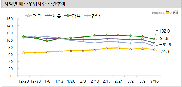 전국 매수우위 지수는 74.3을 기록해 전주(76.5) 대비 하락했다. 서울은 91.8로 전주(101.7) 대비 하락했다. 강남지역은 지난주 94.7에서 82.8로 하락했고, 강북지역도 지난주(109.7) 대비 하락한 102.0을 기록하며 매수문의가 점차 줄어들고 있다.