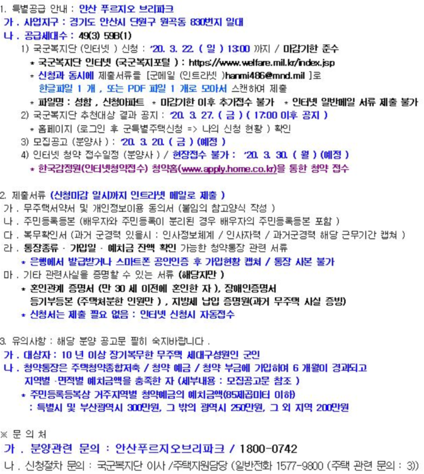 (2) 특별공급 요건 : 10년 이상 장기복무 무주택 세대 구성원 및 군인 / 청약 6개월 경과 / 지역, 면적 예치금 충족(경기 안산 200만 원)