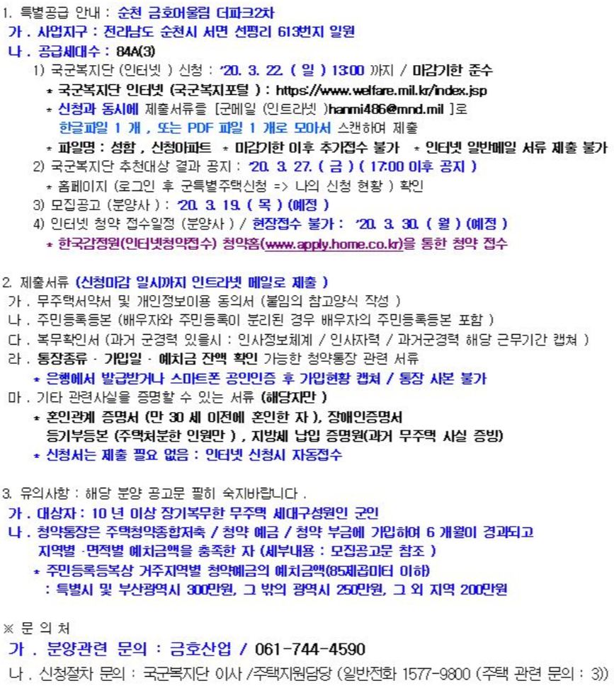 | [군인특별공급] 20-31차 순천 금호어울림 더 파크2차 (전남 순천, ~3. 22) (0) | 2020.03.15 |
