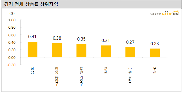 -경기도 아파트 전세가격 변동률은 전주 대비 0.11%로 상승했습니다. 전주 대비하여 하남(0.41%), 안양 동안구(0.38%), 용인 기흥구(0.35%), 군포(0.31%) 등 상승을 보였습니다.
