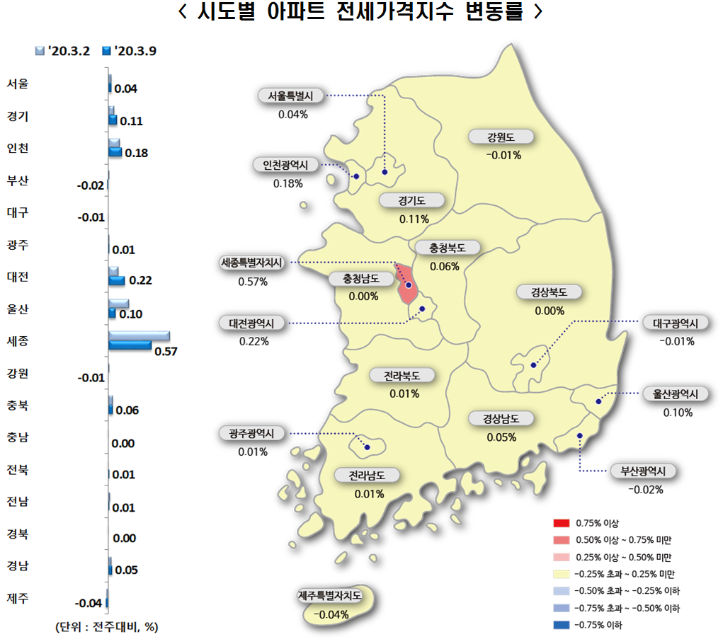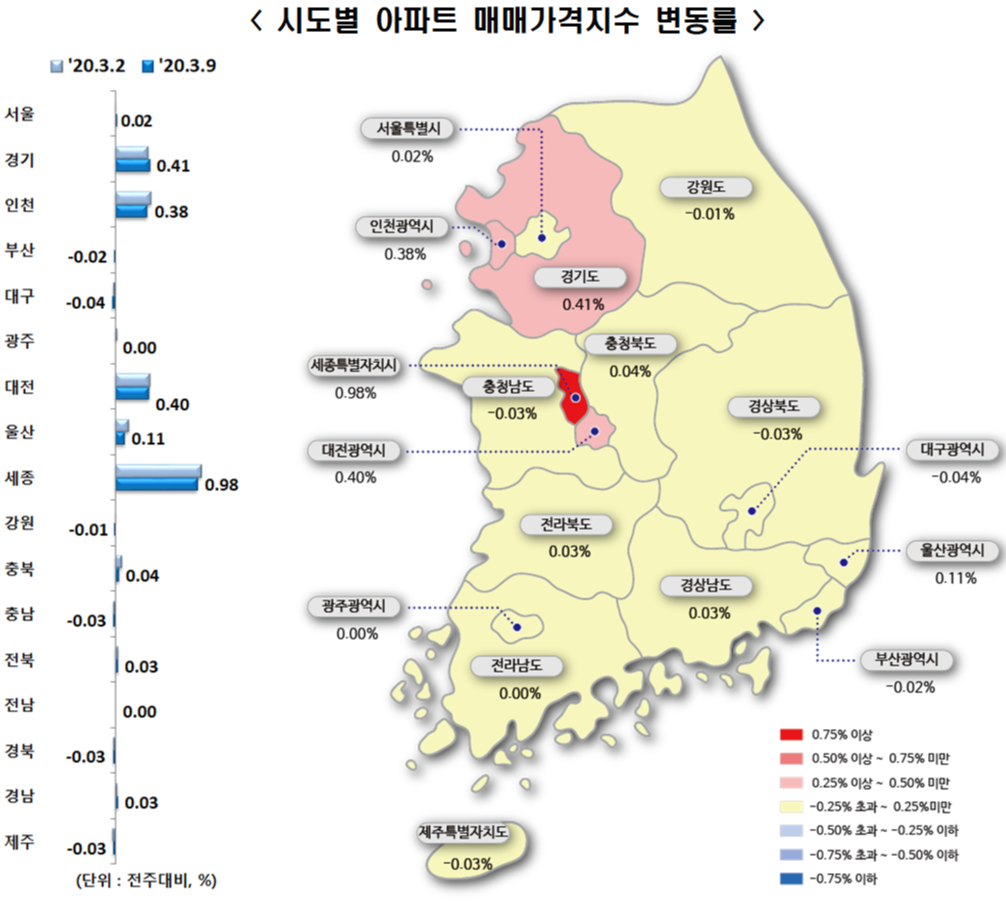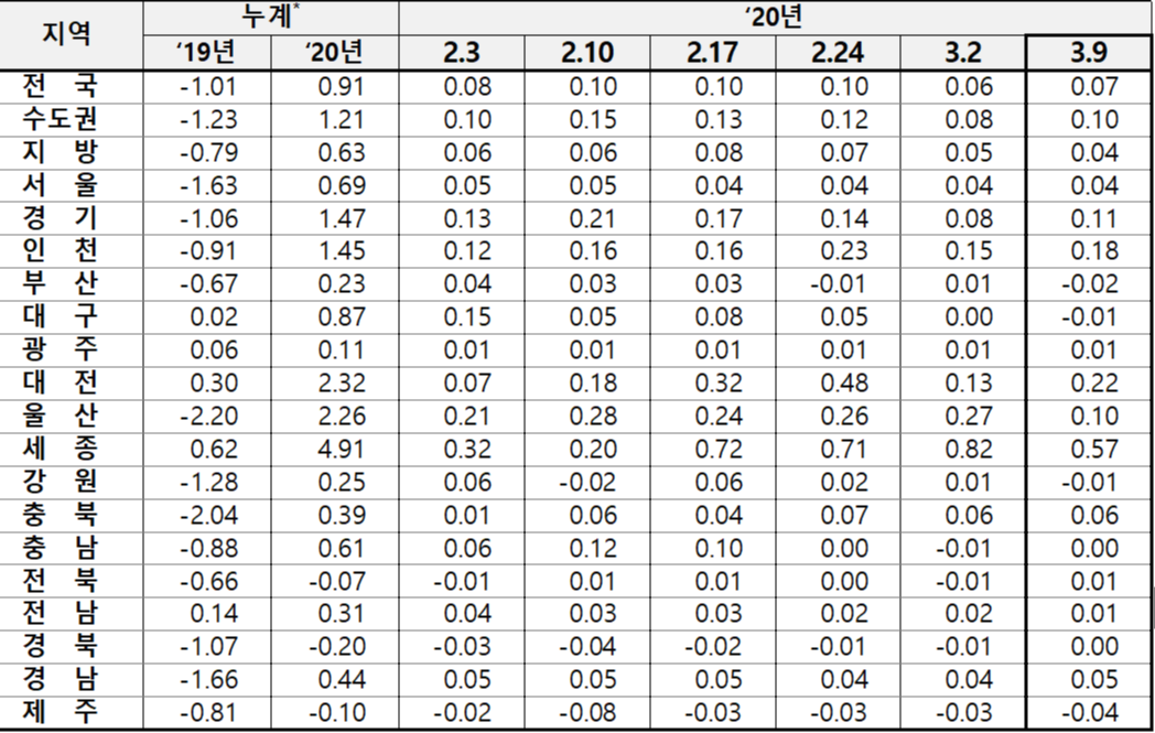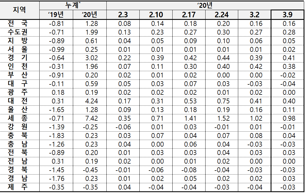 - 서울(0.04%->0.04%)은 코로나 19 확산 우려로 거래 위축되며 대부분 지역에서 안정세를 나타내나, 정비사업 이주 수요 있거나 학군 및 ㅎ역세권 지역, 상대적 가격 수준 낮은 단지 위주로 매물 부족 현상 이어지며 지난주에 상승폭을 유지하고 있습니다.