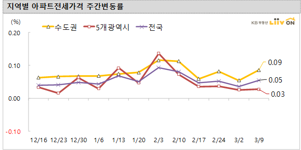 전국 아파트 전세 가격은 전주대비 0.05% 상승을 기록했는데요,수도권(0.09%)과 5개 광역시(0.03%), 기타 지방(0.01%)은 전주대비 상승했습니다.