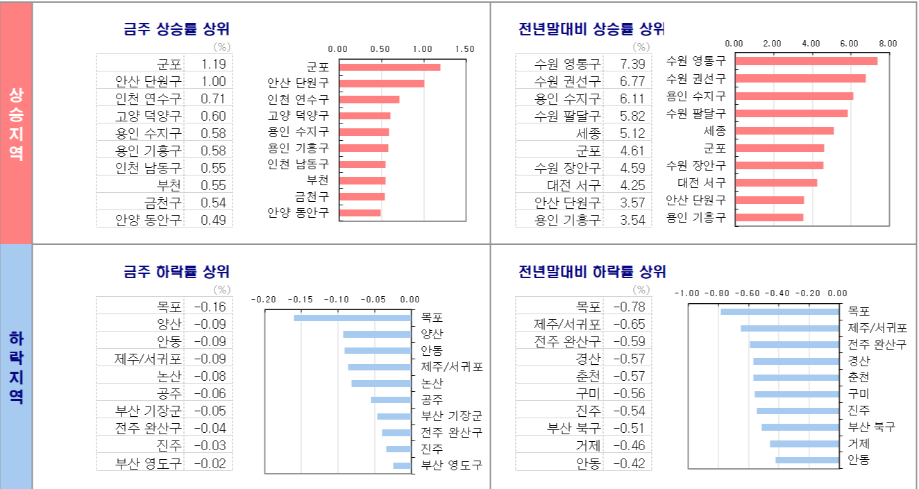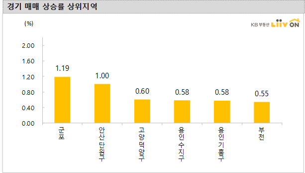 - 경기는 전주 대비 0.29% 변동률을 기록했습니다. 주간 상승률이 상대적으로 높은 지역은 군포(1.19%), 안산 단원구(1.00%), 고양 덕양구(0.60%), 용인 수지구(0.58%) 등인데요,