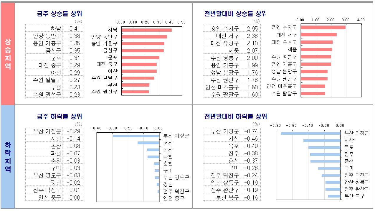 - 인천(0.15%->0.18%)은 상승폭이 확대되었습니다. 부평구(0.28%)는 부개 및 청천동 역세권 단지와 7호선 연장 호재 있는 지역 위주로, 미추홀 구(0.27%)는 용현동 등 정주여건 양호한 대단지 위주로 상승했으나, 동구(-0.13%)는 노후주택 수요 감소로 하락하였습니다.