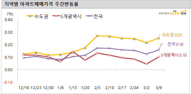 3월2일전국 아파트 매매가격 변동률은 전주 대비 상승(0.16%)을 기록했습니다. 인천(0.37%)과 경기(0.29%), 서울(0.14%)과인천을 제외한 5개 광역시(0.10%)는 대전(0.38%)과 울산(0.13%), 부산(0.04%), 광주(0.03%), 대구(0.02%)가 상승했습니다.
