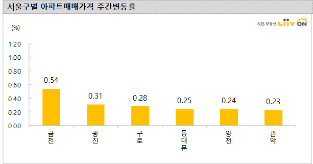 -서울 아파트 매매 가격은전주 대비 0.14%로 상승폭 둔화가 계속되고 있습니다. 주간 상승률이 상대적으로 높은 구는 금천구(0.54%), 광진구(0.31%), 구로구(0.28%), 동대문구(0.25%) 순으로 다른 구에 비해 상승폭이 높았는데요, 반면에 고가주택이 밀집한 강남구(0.04%), 서초구(0.02%) 뿐만 아니라 용산구(0.06%), 성동구(0.10%)도 소폭 상승하는데 그쳤습니다.