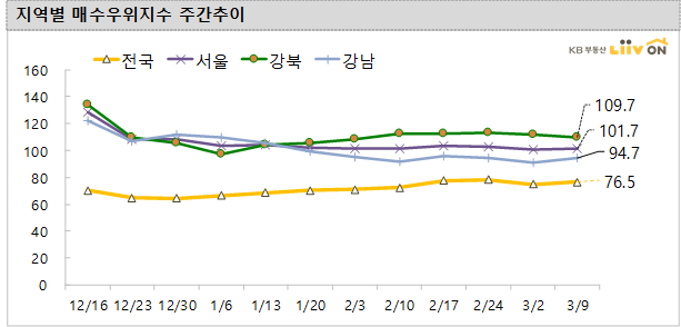 전국 매수우위 지수는 76.5를 기록해 전주(74.8) 대비 소폭 상승했습니다.서울은 101.7로 전주(100.9) 대비 미미하게 상승했는데요,강남지역은 전주 91.1에서 94.7로 소폭 상승했고, 강북지역은 109.7로 지난주(111.9) 대비 하락하며 매수문의가 소강상태를 보이고 있습니다.