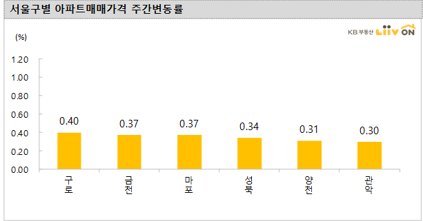 - 서울 아파트 매매가격은 전주 대비 0.16%로 지난주 보다 미미하게 상승폭이 둔화되고 있습니다. 주간 상승률이 상대적으로 높은 구는 구로구(0.40%), 금천구(0.37%), 마포구(0.37%), 성북구(0.34%) 순으로 다른 구에 비해 상승폭이 높았으며, 강남구는 0.05%, 서초구는 0.02%, 용산구는 0.05% 소폭 상승하는데 그쳤습니다.