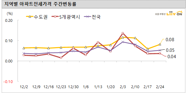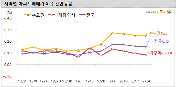 2월 24일 기준 전국 아파트 매매가격 변동률은 전주 대비 상승(0.15%)을 기록했습니다. 경기(0.30%)와 인천(0.27%), 서울(0.16%)은 상승했고, 인천을 제외한 5개 광역시(0.08%)는 대전(0.24%)과 울산(0.15%), 대구(0.07%), 광주(0.04%), 부산(0.02%)은 모두 상승을 보였습니다.