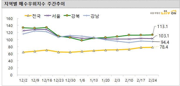 전국 매수우위 지수는 78.4를 기록해 전주(77.5) 대비 소폭 상승했습니다. 서울은 103.1로 전주(103.6)와 비슷하다. 강남지역은 전주 95.9에서 94.4로 소폭 하락하면서 매수문의가 계속 줄어들고 있으며, 강북은 113.1로 지난주(112.3)와 비슷한 수준입니다.