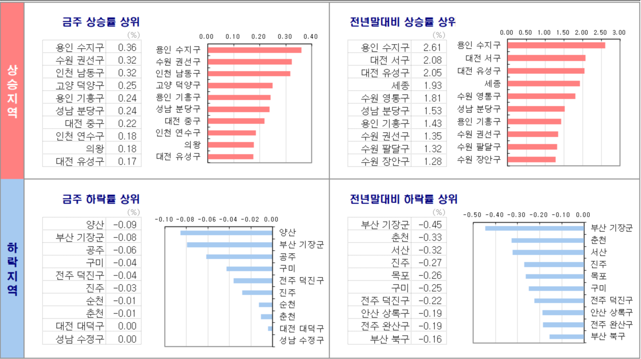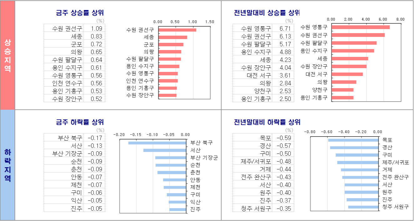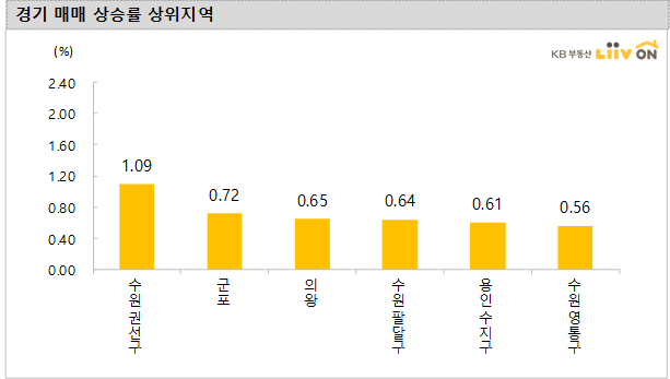 - 경기는 지난주의 상승률 0.31%와 유사한 전주 대비 0.30% 변동률을 기록했습니다. 주간 상승률이 상대적으로 높은 지역은 수원 권선구(1.09%), 군포(0.72%), 의왕(0.65%), 수원 팔달구(0.64%), 용인 수지구(0.61%) 등입니다