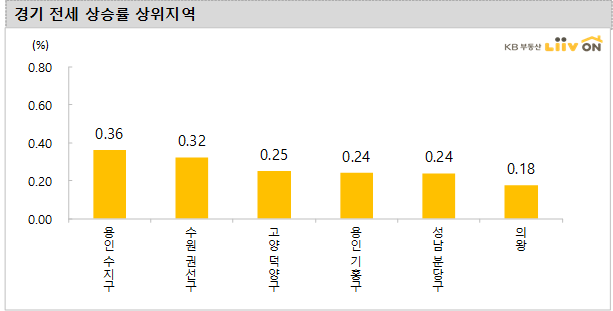 - 경기도 아파트 전세 가격 변동률은 전주 대비 0.10%로 상승했습니다. 전주 대비하여 용인 수지구(0.36%), 수원 권선구(0.32%), 고양 덕양구(0.25%), 용인 기흥구(0.24%) 등 상승을 보였고, 하락 지역은 없습니다.