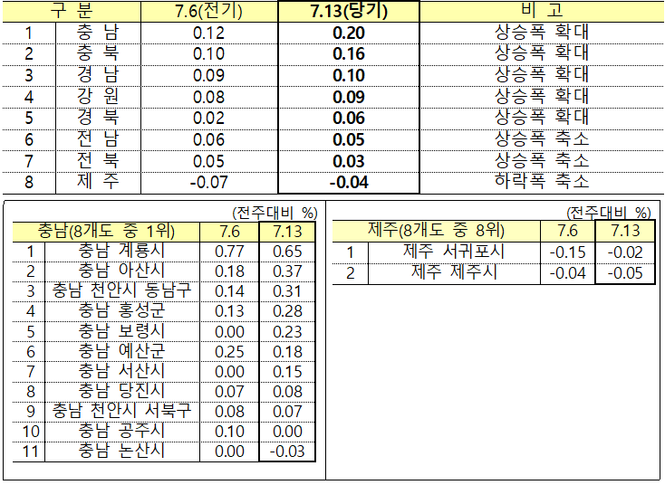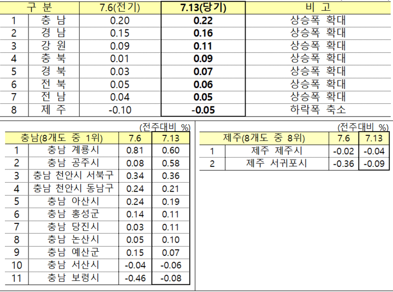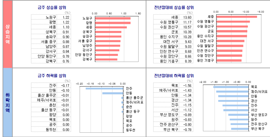 수도권(0.37%)은 전주대비 상승했고, 광역시 이외의 기타 지방(0.06%)도 상승했다. 세종(0.58%), 경북(0.07%), 충남(0.06%), 강원(0.05%), 전남(0.05%), 경남(0.03%), 전북(0.02%)은 상승했고, 충북(0.00%)은 보합을 기록했다.