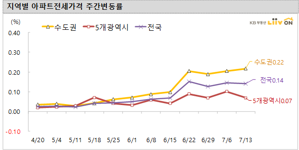 전국 아파트 전세가격은 전주대비 0.12%의 상승을 기록했다. 수도권(0.19%)과 5개 광역시(0.05%), 기타 지방(0.04%)은 전주대비 상승했다.