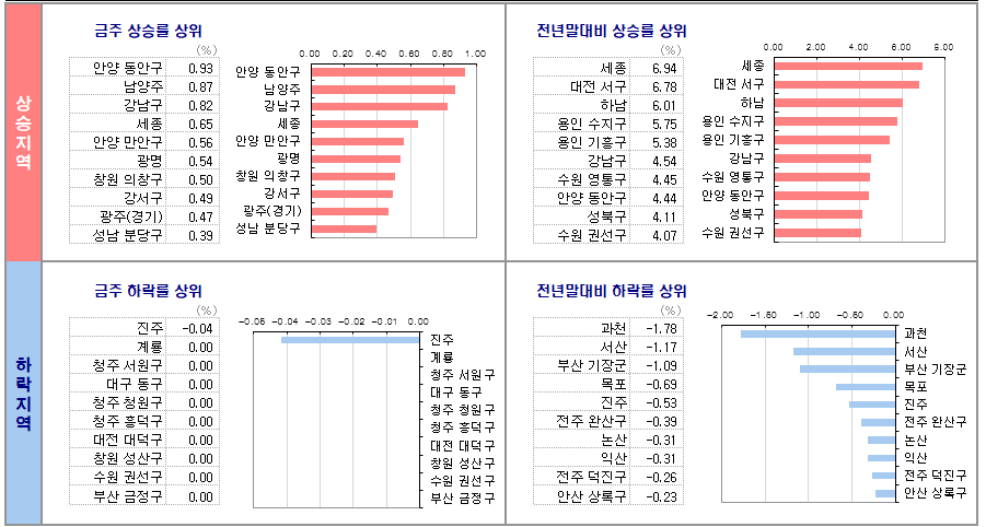 경기(0.29%)는 지난주 대비 상승했고, 서울(0.58%)도 상승했다. 인천을 제외한 5개 광역시(0.13%)는 대전(0.22%), 대구(0.20%), 부산(0.14%), 울산(0.07%)은 상승했고, 광주(-0.02%)는 소폭 하락했다