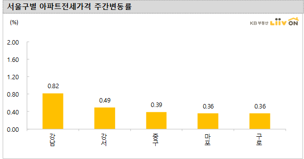 -서울(0.26%)은 전주대비 상승을 기록했다. 강북구(0.71%), 송파구(0.62%), 성북구(0.59%), 동작구(0.39%), 강남구(0.38%)의 상승이 높고, 하락 지역 없이 다수의 지역에서 상승했다.