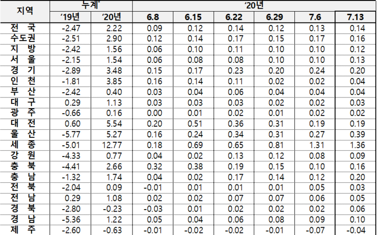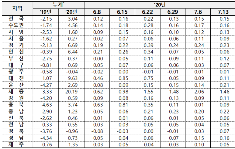 | 2020년 7월 13일 기준 주간아파트가격동향 필사(한국감정원) (0) | 2020.07.19 |