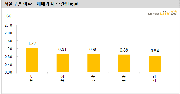 -서울 아파트 매매가격은 지난주에 이어서 이번주에도 전 지역 상승을 보였다. 강북구(1.38%), 도봉구(1.16%), 노원구(0.88%), 양천구(0.84%) 등 높은 상승을 보였다.
